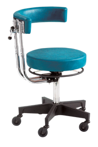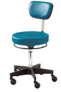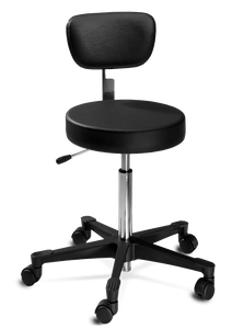 15" round seat with adjustable, tilted, and upholstered backrest. Horizontal and vertical movement tailor the stool to an ergonomic fit.